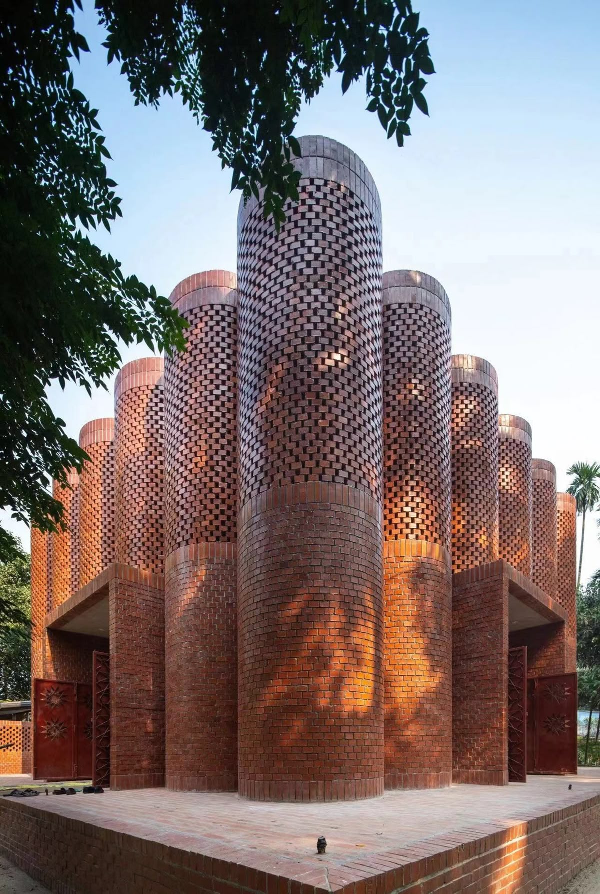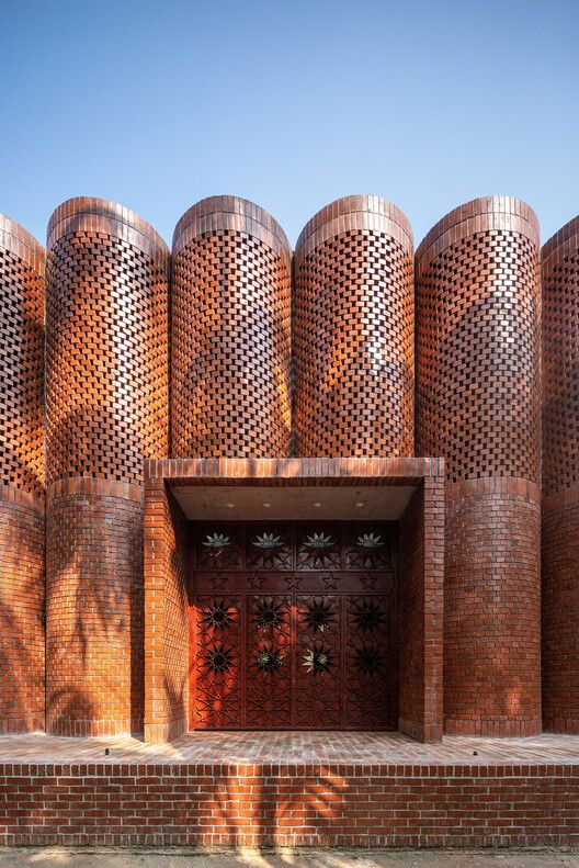 Constructed with raw brick and exuding the precision of the local mason, the spacing of the brickwork provides excellent natural ventilation and soft sunlight filtering into the building, a prerequisite of architecture in tropical climates. At night, the building glows like a lantern when illuminated.