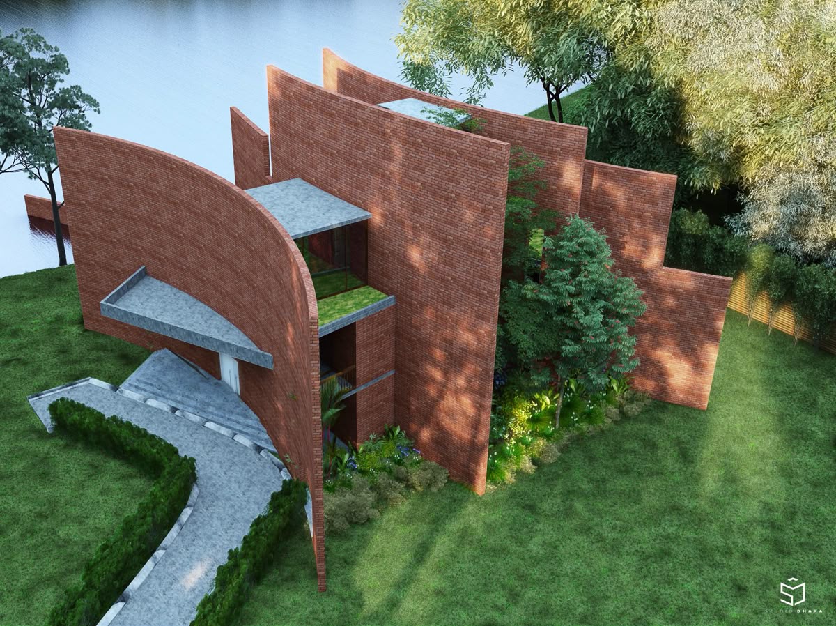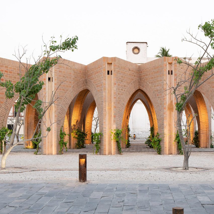 Constructed with raw brick and exuding the precision of the local mason, the spacing of the brickwork provides excellent natural ventilation and soft sunlight filtering into the building, a prerequisite of architecture in tropical climates. At night, the building glows like a lantern when illuminated.
